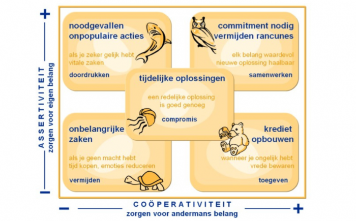• Links bovenin bevindt zich de haai: de meest assertieve persoon, degene die zich niet bekommert om samenwerking of het welbevinden van mensen in zijn omgeving, zolang als hij zijn eigen doelen realiseert. Waarmee ook gelijk is aangegeven dat bij elk type zowel een positieve als een negatieve connotatie gemaakt kan worden.